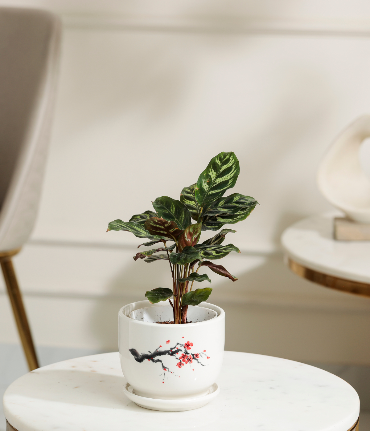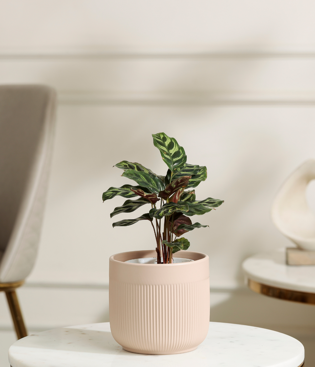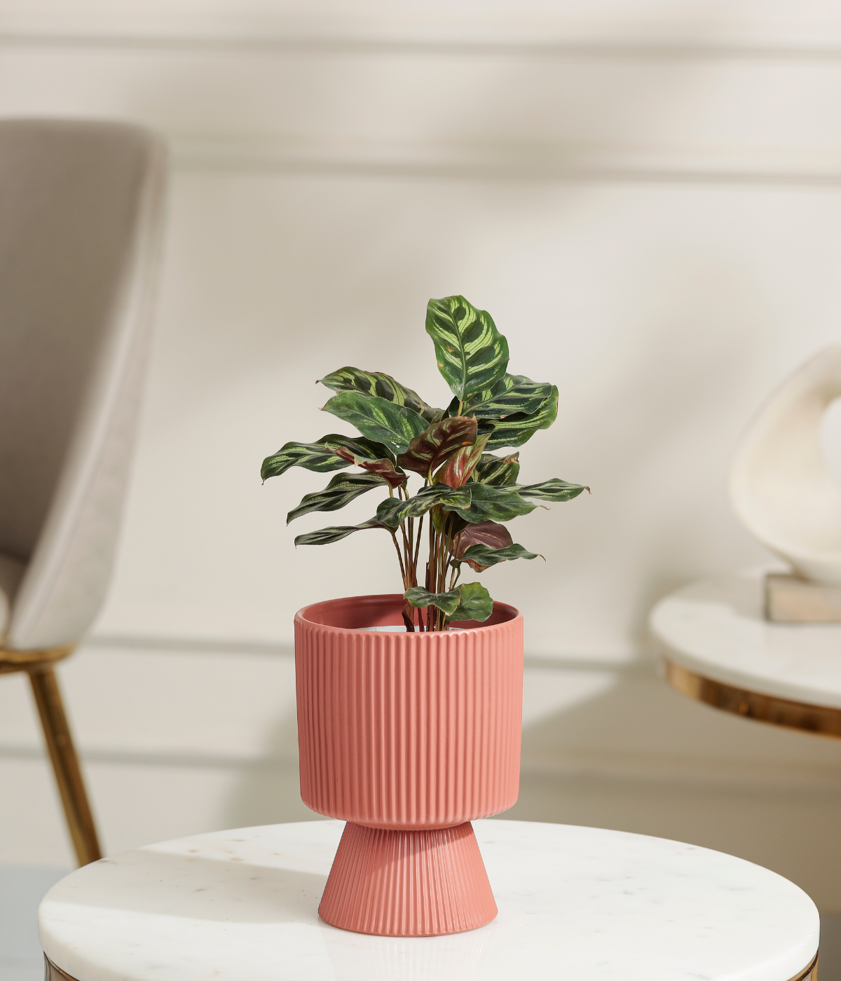 Bring a touch of beauty and sophistication to your indoor space with the Peacock Plant, known for its striking feather-like patterned leaves in shades of green and purple. This compact, low-maintenance plant is perfect for homes, offices, or decorative planters, adding elegance and a refreshing vibe to any interior.