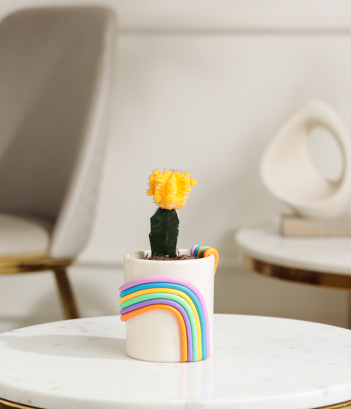 Bring a cheerful pop of color to your indoor space with the Yellow Moon Cactus, featuring a bright yellow top grafted onto a green base. This compact and striking cactus is low-maintenance, hardy, and perfect for homes, offices, or decorative planters, adding a lively touch to any décor.